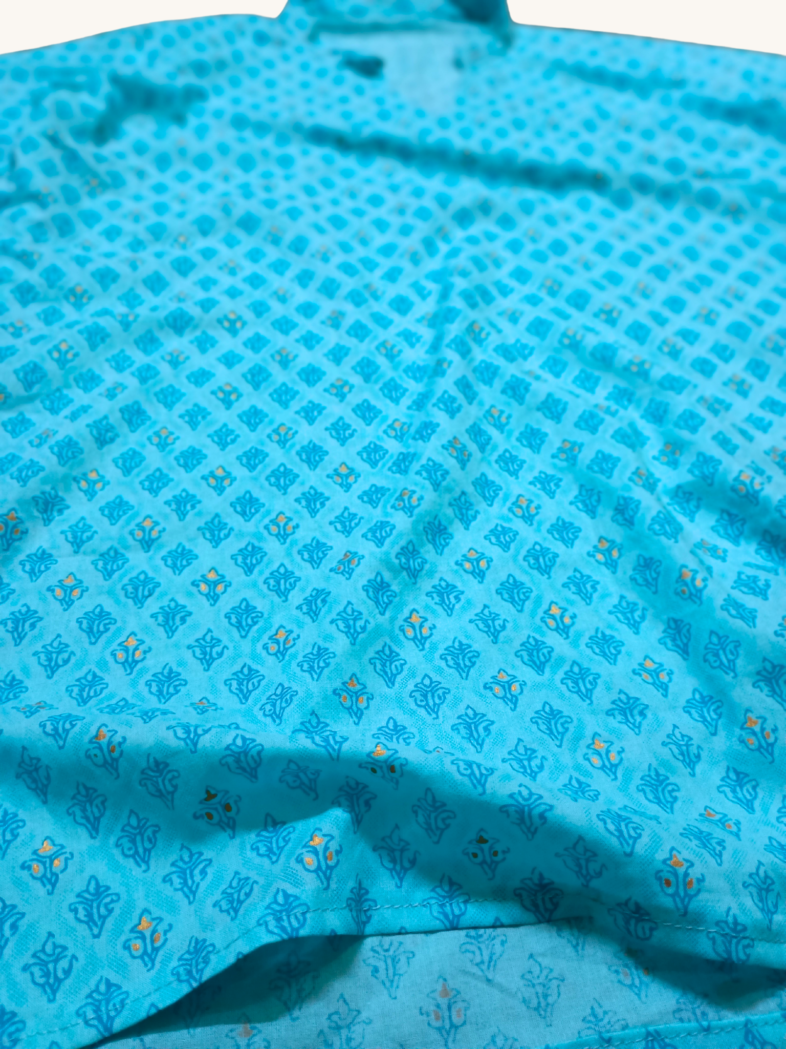 Shop this light blue printed short kurti with V-neck and half sleeves. Perfect for daily wear, office, or casual outings. Stylish & comfortable.